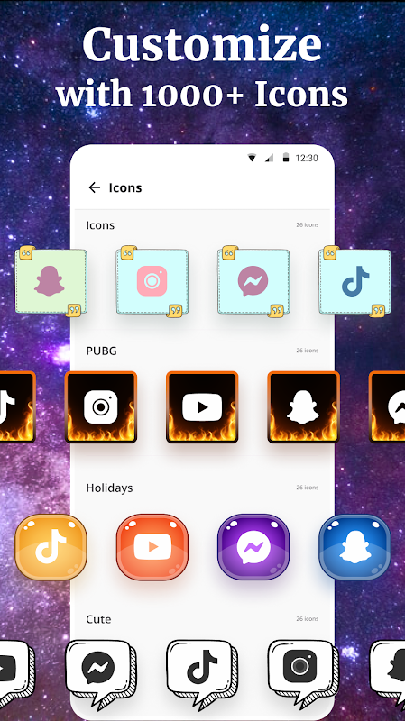 🌸Icons wallpapers and themes: Explore 300+ different icon themes like Minimal, Galaxy, Cotton Candy, Navy, Christmas Wreath, and many more