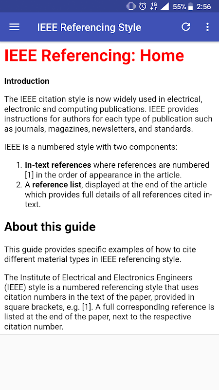 The Institute of Electrical and Electronics Engineers (IEEE) style is a numbered referencing style that uses citation numbers in the text of the paper, provided in square brackets, e.g. [1]. A full corresponding reference is listed at the end of the paper, next to the respective citation number.
