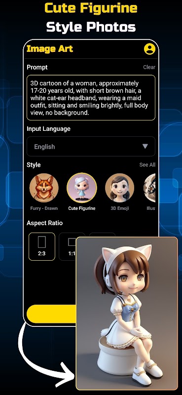 ► Łatwe i natychmiastowe: po prostu wpisz monit, wybierz styl i zobacz, jak Twoja grafika ożywa w mgnieniu oka.