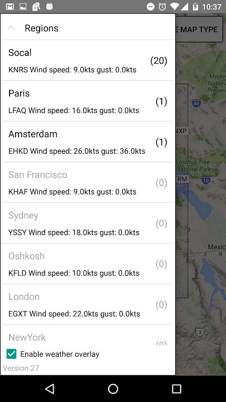 - Weather overlay: A colored map overlay showing the windiest airports on the map.