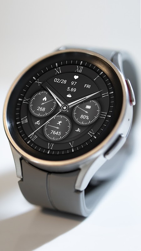 Pokrętło obsługuje system Wear OS 1. Zewnętrzny okrąg: Aplikacja niestandardowa 2. Góra: Data, Tętno, Tydzień, Dystans 3. Centralny: Wskaźnik kalorii i procentów, poziom naładowania baterii i wskaźnik procentów 4. Dół: Niestandardowa aplikacja, Kroki, Wskaźnik procentu docelowego kroku Dostosowywanie: Dostępnych jest wiele obszarów dostosowywania do wyboru Zgodne urządzenia: Pixel Watch, Galaxy Watch 4/5/6/7 i nowsze oraz inne urządzenia