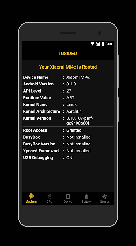 INSIDEU pokazuje informacje o urządzeniu, takich jak procesor, rdzeni, prędkość modelu, ram, czujników itp a nie jak inne aplikacje CPU Info, INSIDEU również może sprawdzić dostęp administratora.