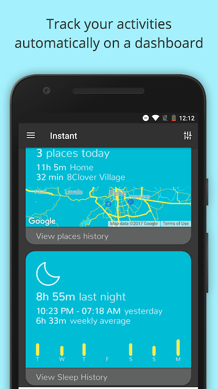 Dashboard for your life with actionable insights on your tracked data. You can interact with your Insights, Instant Coach & get weekly reports to understand your data. Also, with Goals to help you improve your productivity and have a healthier life! Keep track of all your screen time addiction for Digital Wellbeing, moves & places throughout the day. Instant lets you track & analyze your activities on a dashboard!
