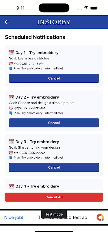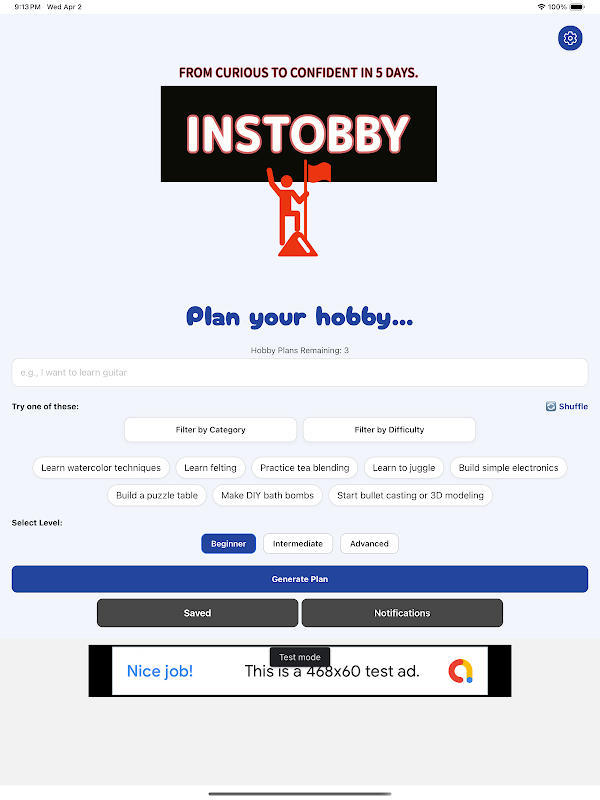 Po prostu wpisz, co Cię interesuje – czy jest to „obróbka drewna”, „rysunek”, „fotografia”, czy nawet „nauka gry na gitarze” – a Instobby natychmiast wygeneruje ustrukturyzowany 5-dniowy plan startowy zawierający wszystko, czego potrzebujesz na początek.