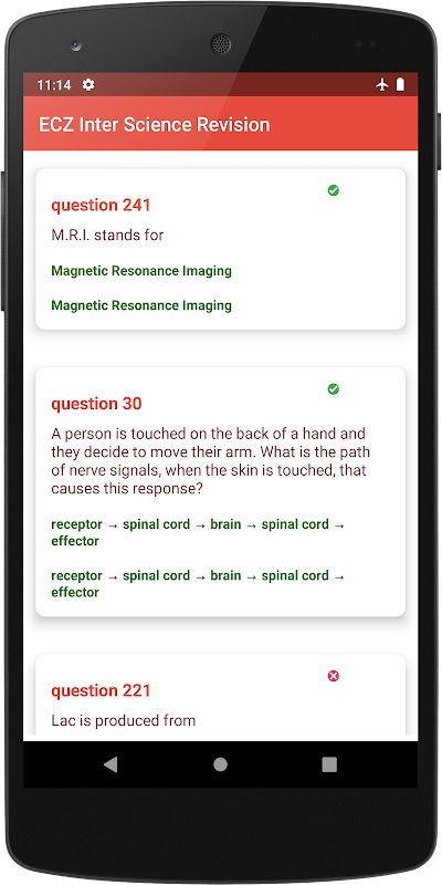 Gdy student przeczyta notatki, może przejść do pytań egzaminacyjnych wielokrotnego wyboru. Pytania są losowane za każdym razem, a po każdym quizie wyświetlany jest wynik. Uczeń może następnie przejść przez pytania, sprawdzając, co jest nieprawidłowe, a także pokazać poprawną odpowiedź na każde pytanie.