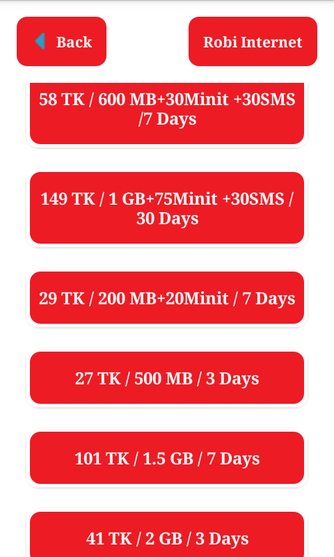 ” Internet package Robi-রবি ইন্টারনেট প্যাক” আমাদের এ এ্যাপস টিতে রবি সিমের সকল নতুন আপডেট বিভিন্ন ইন্টারনেট প্যাকেজ এর তথ্য দিয়ে সাজানো হয়েছে। আপনাদের আর কষ্ট করে দোকানদার দের বলতে হবে না শুধু মাত্র আমাদের এ এ্যাপস আপনার মোবাইল এ থাকলে আপনি নিজে নিজেই বিভিন্ন ইন্টারনেট প্যাকেজ নিতে পারবেন অতি সহজেই । যেভাবে ইন্টারনেট নিবেন , প্র্রথমে কোন প্যাকেজ টি নিবেন তা দেখুন, এবং সে প্যাকেজ টির activation code Dial এর উপর চেপে ধরে কোডটি সিলেট করে তা Copy করে ,আপনার মোবাইলের Keypad এ তা Paste করুন । তাহলে নির্দিষ্ট পরিমান ইন্টারনেট প্যাকেজ টি পেয়ে যাবেন ।