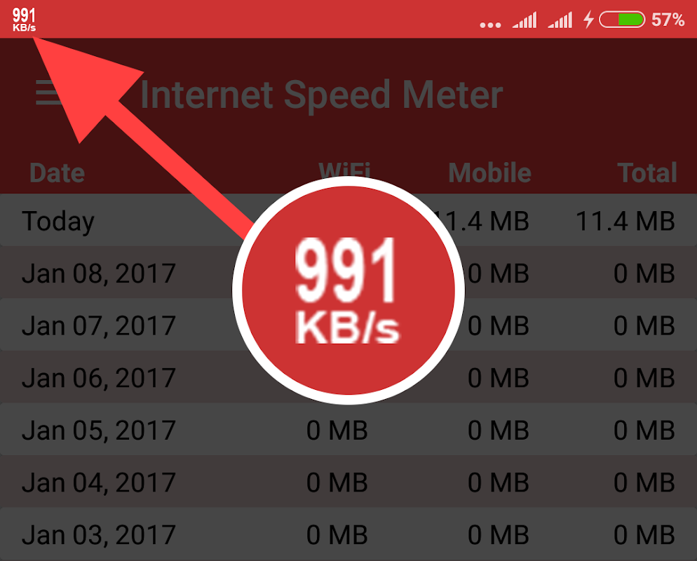 Miernik prędkości Internet wyświetla prędkość Internetu na pasku stanu, który wyświetla ilość danych używanych w powiadomieniach, co pomaga monitorować połączenie sieciowe.