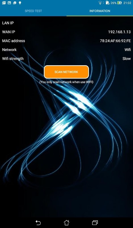 - Wyświetlanie informacji o sieci IP (LAN, WAN IP, adres MAC, wytrzymałości, siły WiFi Komórka dane, informacje o przeglądarce Internet Service Provider)