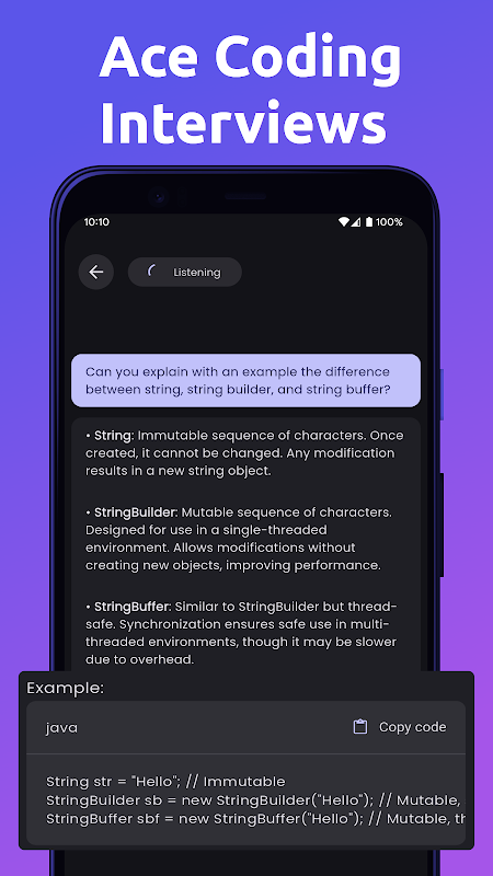 Dzięki aplikacji AI Mock Interview Practice magia dzieje się na ekranie, gdy odpowiadasz na trudne pytania. W ciągu kilku sekund aplikacja podpowiada, jak poprawić ton i treść rozmowy. Wystarczy nacisnąć przycisk Start i pozwolić, aby aplikacja AI Mock Interview Practice zadziałała swoją magią. Pomaga to rozwiać obawy związane z nieoczekiwanymi pytaniami. Za każdym razem, gdy uruchomisz aplikację AI Mock Interview Practice, uzyskasz idealne wyniki.