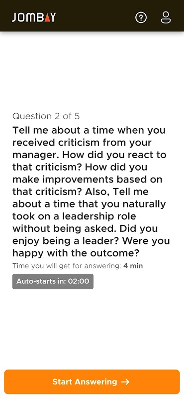 Za pomocą Interview by Jombay kandydat może nagrywać odpowiedzi wideo na pytania zawarte w rozmowie. Kandydaci będą mogli przeglądać pytania w aplikacji, przygotować swoją odpowiedź w wyznaczonym czasie i nagrać swoją odpowiedź.