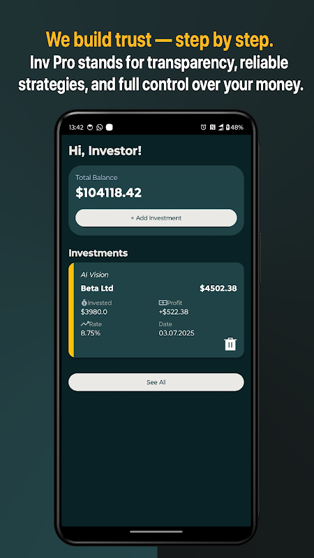 Chcesz pomnożyć swoje pieniądze bez stresu i zamieszania? Inv Pro oferuje przejrzysty, bezpieczny i transparentny sposób inwestowania w najlepsze firmy i łatwego śledzenia zysków.