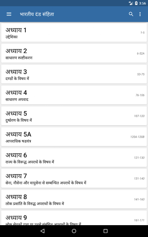 Aplikacja zawiera szczegółowe informacje na temat kodeksu karnego Indii w hindi, angielskim i gudżarati.