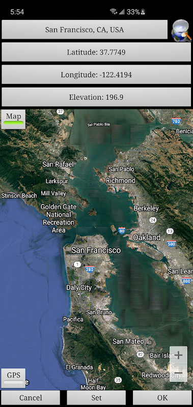 • Wprowadzanie mapy — użyj mapy, aby powiększyć i przesunąć do lokalizacji. Naciśnięcie przycisku Ustaw powoduje ustawienie nazwy lokalizacji, współrzędnych i wysokości w polach tekstowych. Wysokość bieżących współrzędnych jest pobierana przy użyciu określonego ustawienia źródła danych wysokości. Przełączaj się między trybem mapy i satelity, przełączając przycisk Mapa/Sat.