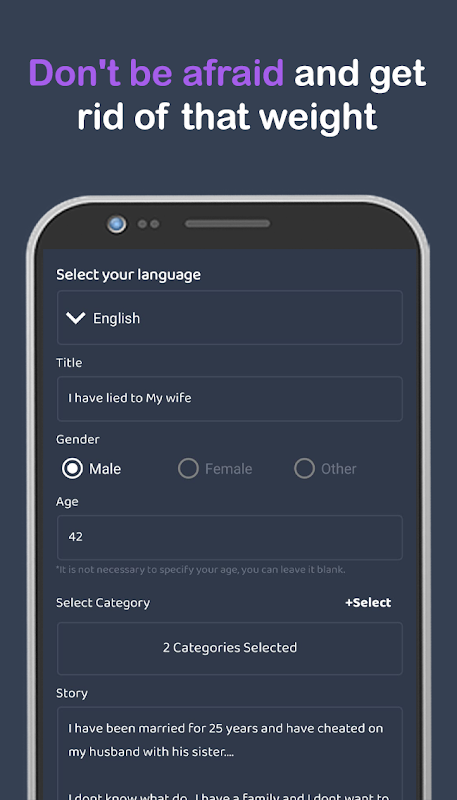 An application where you can publish your confessions of any kind without revealing your identity. Don't be afraid, no one is perfect and we have all committed at some point in our lives something that we are not proud of.