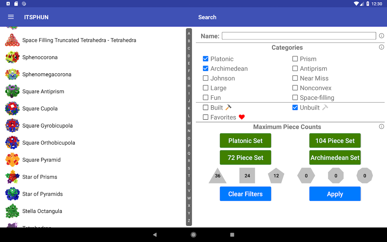 Learn more about 3D geometry while having fun! This app contains a large (and growing) searchable database of models that can be built with ITSPHUN Geometric Art construction sets. The models are presented along with construction tips and math information. The browser also contains explanations for the math concepts and construction methods used. The objects can be tagged as built or favorite and the models can be searched using these and other criteria.