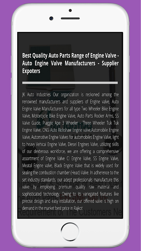 Dzięki naszemu bogatemu doświadczeniu w tej dziedzinie oferujemy naszym klientom wysokowydajne zawory silnikowe i prowadnice. Produkty te są znane ze swojej trwałości i długiej żywotności. Uznane nazwy, takie jak Two Wheeler Engine Valve, Three Wheeler Engine Valve, Four Wheeler Valve Engine, Commercial Vehicals Engine Valve, Heavy - Light Vehical Engine Valve itp. Korzystały z naszych produktów i doceniły je. Zatrudniamy zespół doświadczonych specjalistów w branżach, którzy pomagają nam płynnie prowadzić nasz proces produkcyjny. Nasz zespół składa się z ekspertów technicznych, inżynierów, kontrolerów jakości, współpracowników badawczo-rozwojowych, administracji i zarządzania oraz wykwalifikowanych pracowników. Rozumieją wymagania naszych klientów i odpowiednio produkują asortyment o jakości eksportowej międzynarodowej standardowej podstawie Zawór silnika Pod kierunkiem naszego właściciela, „Mr. Ashvin Bhai”, udało nam się zapewnić czołową pozycję na rynku. Jego starannie opracowane strategie i motywacja pozwoliły nam zaznaczyć silną pozycję w tej dziedzinie.