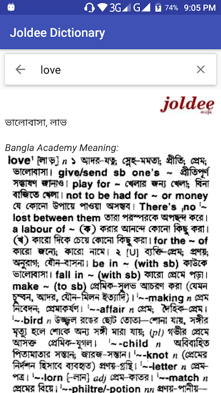 Joldee Dictionary contains a lot of features. It provides a lots of Bangla meanings of English words.