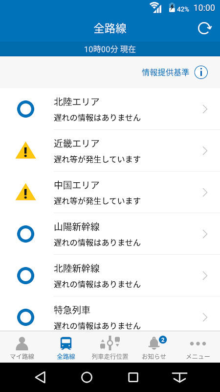 Możesz wyświetlić i potwierdzić informacje operacyjne o wszystkich trasach JR Zachodniej Japonii na liście. W przypadku rejonu Hokuriku, rejonu Kinki, rejonu Chugoku, Shinkansen i ograniczonych pociągów ekspresowych poinformujemy Cię, czy istnieją informacje o opóźnieniu dla każdego obszaru, i możesz sprawdzić bardziej szczegółowe informacje operacyjne na szczegółowym ekranie.