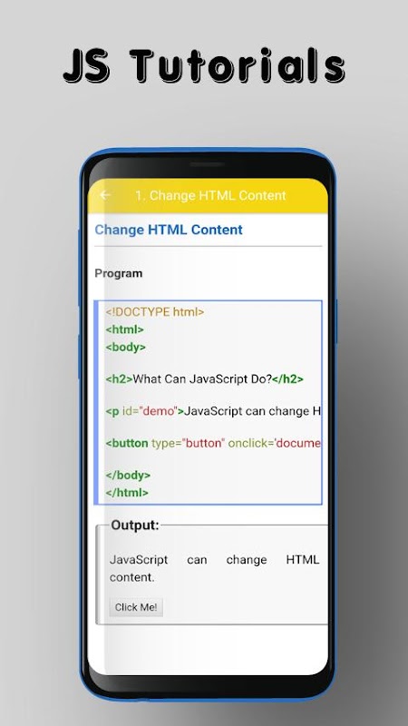 "JS Tutorial - Learn JavaScript" is a best application in play store to learn easily javascript for js developer. "JS Tutorial - Learn JavaScript" provides basic and advanced concepts of JavaScript. Our "JS Tutorial - Learn JavaScript" is designed for beginners and professionals.