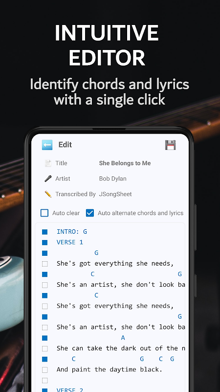 Utwory i nuty na gitarę z akordami, tekstami, automatem perkusyjnym, looperem i wieloma innymi...