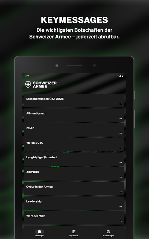 Aplikacja „Keymessages” armii szwajcarskiej zapewnia przegląd głównych tematów i komunikatów armii. Aplikacja służy jako źródło informacji dla członków armii i osób zainteresowanych poznaniem aktualnego rozwoju sytuacji i podstawowych postaw armii szwajcarskiej.