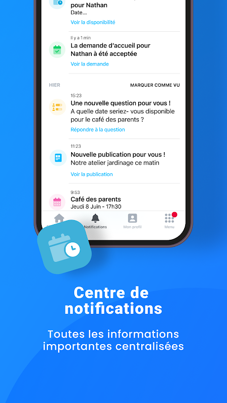 Rodzice mogą znaleźć różne treści publikowane przez zespoły nadzorujące: przydatne informacje, menu, kalendarz, spotkania, zdjęcia, filmy, w skrócie wszystko, co pozwala im lepiej zrozumieć projekt edukacyjny lub być na bieżąco podczas pobytu odkrywczego.