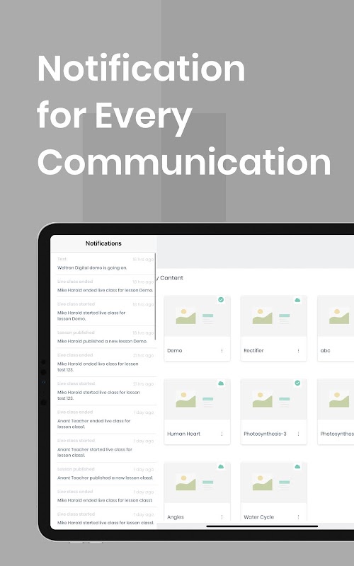 Po otrzymaniu powiadomienia od nauczycieli o współużytkowanych zasobach, zadaniach i ocenach w natywnych aplikacjach uczniowie mogą uzyskać dostęp do bogatych multimedialnych lekcji, repozytorium treści, prób oceny, natychmiastowego oceniania i oceny swojej wiedzy we własnym tempie.