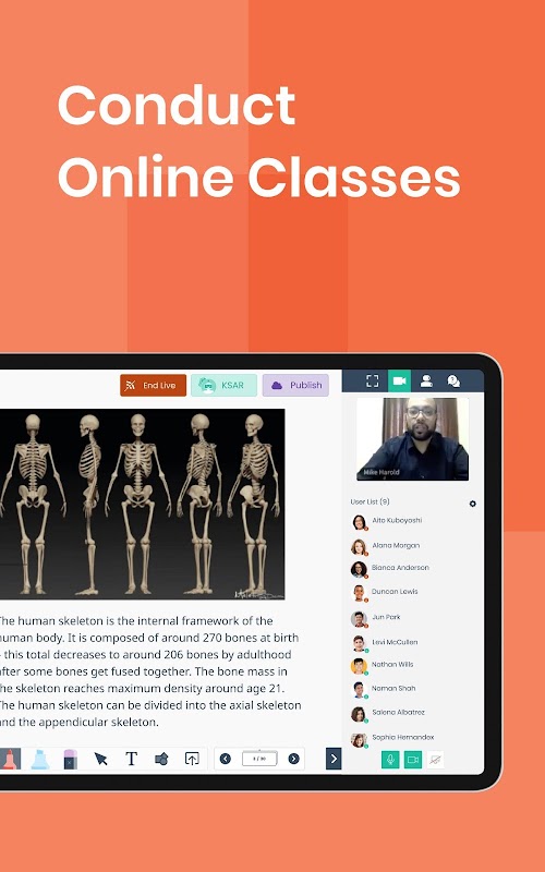 Nauczyciele mogą prowadzić zajęcia na żywo lub wirtualne (z włączoną obsługą audio i wideo) z dowolnego miejsca, udostępniając uczniom interaktywne materiały do nauczania.