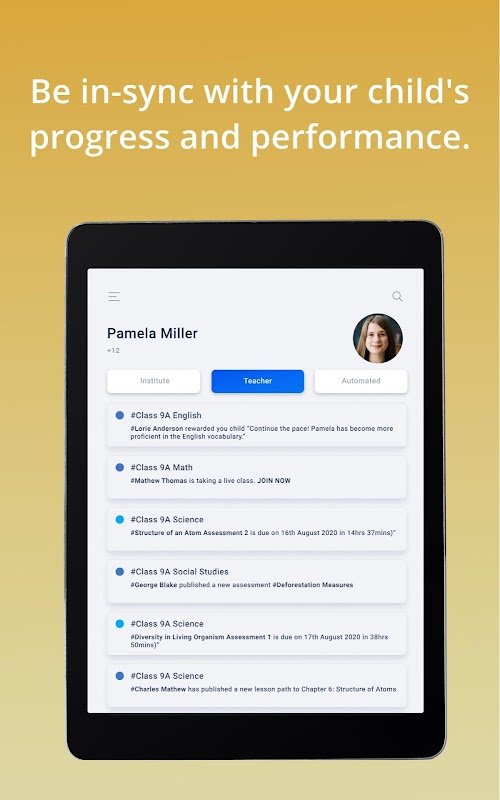 For any published lessons or shared resources, parents will get a notification on their app through which they can assist the child, track it, and help with it.