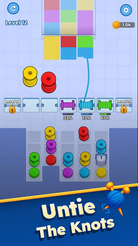 Knit Rush to szybka, hiper-swobodna gra logiczna, w której Twoim wyzwaniem jest usuwanie linii kolorowych węzłów z góry, uwalniając liny, które muszą znaleźć pasujące szpulki poniżej.