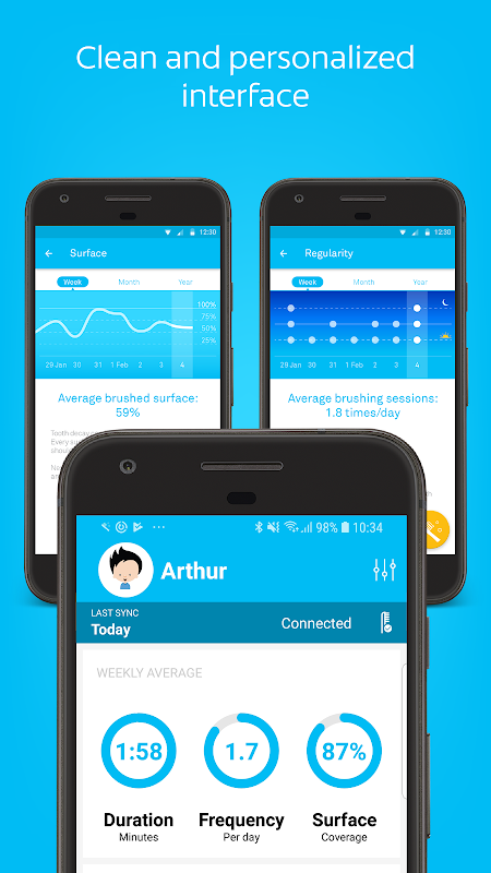 Zostaw swój telefon w drzwiach łazienki! Myj zęby i Ara automatycznie synchronizować wszystkie swoje szczoteczkami sesje z telefonem przez Bluetooth, można spojrzeć na nich w aplikacji.