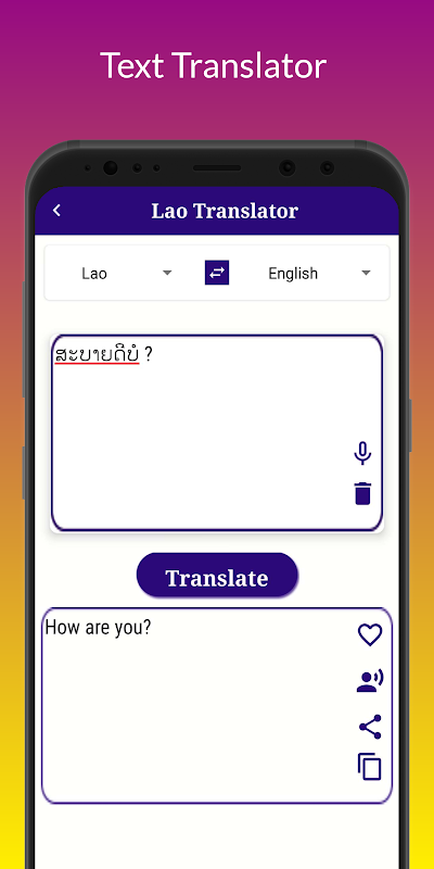 👉 Pobierz teraz Lao Translator i wyrusz w podróż odkrywania języka i zrozumienia kulturowego. Ta aplikacja jest bardzo pomocna i przydatna zarówno dla studentów, jak i osób niebędących studentami, a także pomocna dla tych, którzy chcą nauczyć się języka laotańskiego. Ta aplikacja jest bardzo łatwa w użyciu. Aby korzystać z tej aplikacji, nie trzeba mieć dodatkowej wiedzy.