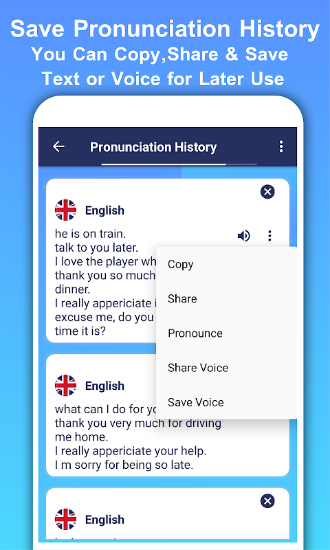 Language Pronunciation Learn Listening & Speaking supports text pronunciation, voice to text pronunciation, clipboard or copy text pronunciation with unlimited voice input & output. Pronounce All using speech to text, text to speech, voice to text & text to voice this will help you to improve listening, speaking, pronunciation & vocabulary while conversations with foreign peoples.