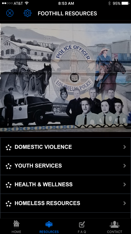 Some of the resources that are available in this mobile app are: Foothill Station directory, Detective Desk, Jeopardy youth outreach program,domestic violence laws, homeless resources, health clinics,legal aid, mental health, as well as free counseling and victim resources.