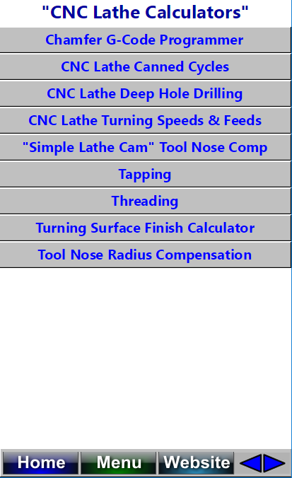 Web Machinist ma wiele kalkulatorów dla obrabiarek CNC, programistów i inspektorów kontroli jakości. Łącznie z kalkulatorami do kątów, aplikacjami CNC, tokarkami CNC Fanuc Canned Cycles, w tym kalkulatorami cyklu gwintowania G76, prostymi tokarkami CNC, tokarkami CNC, korektą nosa, kalkulatorami G, fazowaniem kalkulatorów G, przeliczeniami metrycznymi, kalkulatorami głębokości pogłębiania stożkowego, kalkulatorami głębokości wiercenia centralnego, Konwersje ogólne, Wiercenie CNC, Frezarka CNC i tokarka Głębokie wiercenie Kalkulatory, Kalkulatory pomiaru jaskółczego ogona, Symbole planu, Kody G, Kody M, Formuły obróbki i kalkulatory, Formuły prędkości i prędkości posuwu i kalkulatory, wzory rozwiązywania kół, Wzory otworów, Otwór Wzorce macierzowe, w tym wzory pełnego okręgu i koła częściowego, 3 nici drutowe Kalkulatory średnicy podziałowej gwintów zunifikowanych, gwintów metrycznych, gwintów Acme i metrycznych gwintów trapezowych, tokarki CNC Narzędzia do obliczania promienia promienia, kontrola QC, obróbka ręczna, wskaźniki usuwania metalu, CNC Frezowanie, Odniesienie, Oś obrotowa, Prędkości i pasze, Imperial i moduł Spur Gear Wymiary rs, gwintowanie CNC, gwintowanie CNC, ręczne kalkulatory tokarskie, gwint zunifikowany, gwint metryczny, gwint Acme, metryczne gwinty trapezowe, przekładnie walcowe, przekładnie czołowe modułu, przekładnie czołowe imperialne, kalkulatory powierzchni, trójkąty, kalkulatory kół, oprzyrządowanie maszyny młynkowej, wymiary tulei , Keyseat Cutters Kalkulatory, kalkulatory trygonometryczne, kalkulatory wzoru otworów, kalkulatory wzoru śruby koła, ręczne kalkulatory młynkowe, oprzyrządowanie i sprzęt, kalkulatory Sine Bar i Compound Sine Plate, trygonometria i geometria, kalkulatory matematyczne sklepu, kalkulatory prędkości wrzeciona tokarki, kalkulatory prędkości gwintowania CNC , Kalkulatory chropowatości powierzchni, kalkulatory prędkości wiercenia, kalkulatory prędkości gwintowania, toczenie CNC i kalkulatory różne. Jest to obowiązkowy program dla mechaników, obrabiarek CNC, obrabiarek, inspektorów kontroli jakości, operatorów systemów CNC, programistów CNC.