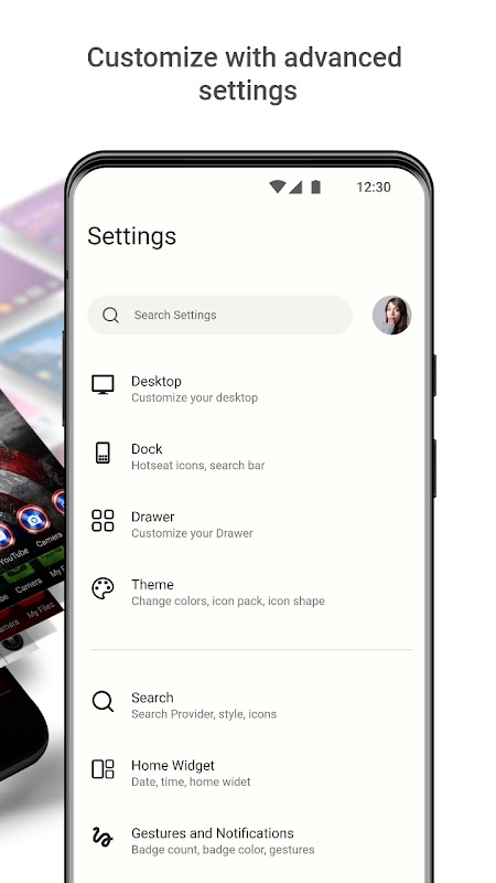 • Konfigurowalna szuflada aplikacji: przewijanie w pionie lub poziomie, efekty strony oraz opcje kart lub wciągające to tylko niektóre z rzeczy, które znajdziesz w szufladzie aplikacji.