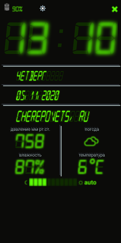 To świetny nocny zegar. Powtarzają funkcje starych wyświetlaczy LCD. Zegar pokazuje pogodę, temperaturę (w stopniach Celsjusza lub Fahrenheita), wilgotność i ciśnienie. To także stacja pogodowa. Po dotknięciu ekranu zegar określa godzinę, dzień tygodnia i datę. Możesz dostosować jasność ekranu. To sprawi, że zegar będzie naprawdę nocny. Po naciśnięciu zegarek emituje dźwięk starej elektroniki.