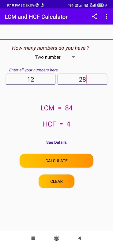 Jest to prosta aplikacja kalkulatora LCM i HCF (GCF / GCD). Zajmuje wprowadzenie do 9 liczb. Pokazuje szczegółowe krok po kroku rozwiązanie każdego problemu. Ta aplikacja pokazuje rozwiązanie w trzech metodach, a mianowicie - metoda współczynnika Prime, metoda podziału Ladder, metoda listy.