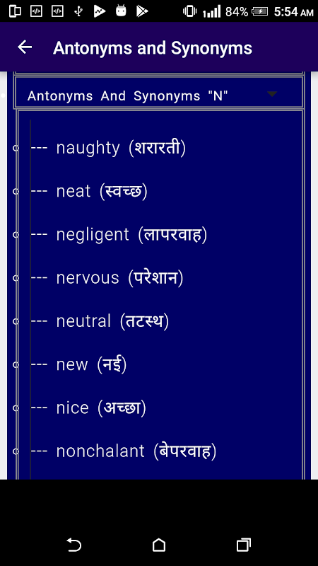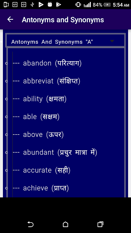 Ta aplikacja zawiera synonimy, antonimy, podstawienie jednego słowa i ważne słownictwo z hindi znaczeniem dla określonego słowa.