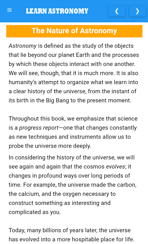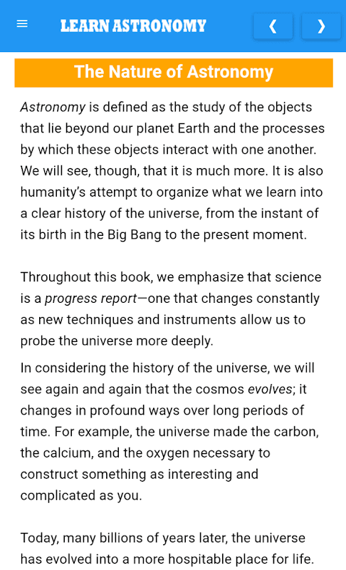 Aplikacja Learn Astronomy zawiera cyfrowy podręcznik z treściami takimi jak: