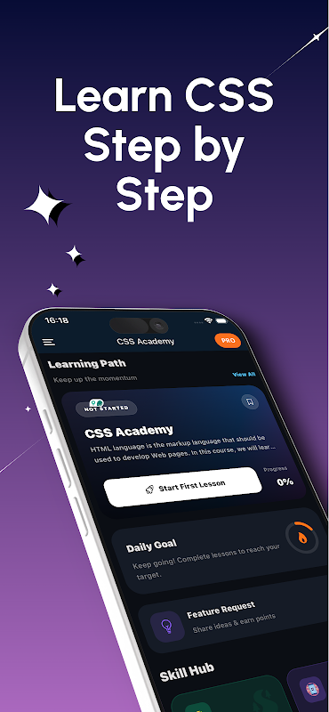 Początkujący CSS: Jeśli dopiero zaczynasz przygodę z CSS, ta aplikacja zapewnia jasne i uporządkowane lekcje, zaczynając od podstaw i pomagając krok po kroku opanować koncepcje CSS. Z łatwością ucz się HTML i CSS od podstaw.