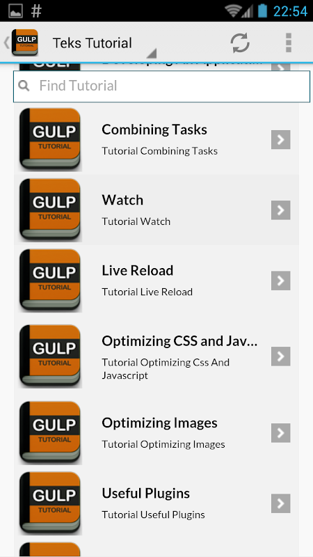 Najlepszy i kompletne Gulp Tutorial. Ta aplikacja zawiera dziesiątki ćwiczeń nauczyć Gulp począwszy od podstawowego. Wszystkie tutoriale offline, bez połączenia z Internetem. Oto lista tutoriali dostępnych w tej aplikacji: