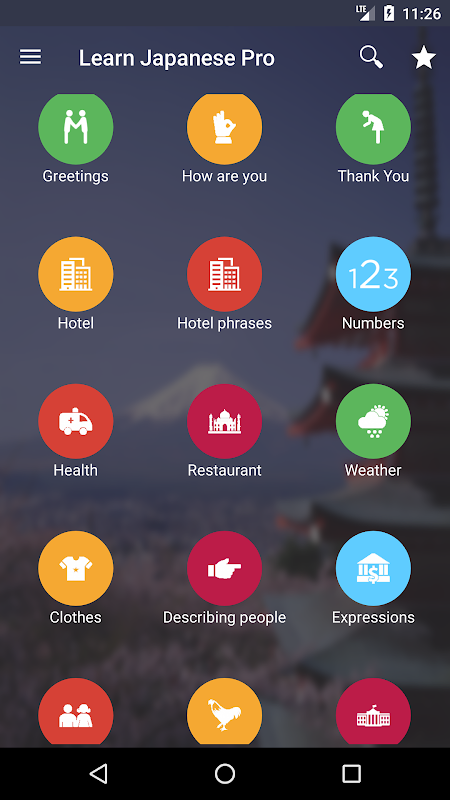 Learn Japanese obejmują ponad 5000+ frazy, 65 kategorie, 200 lekcji gramatyki