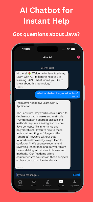 Wbudowany chatbot AI jest zawsze gotowy do pomocy. Niezależnie od tego, czy masz problemy z pętlami, klasami czy debugowaniem, chatbot zapewnia natychmiastowe odpowiedzi i dostosowane wyjaśnienia, dzięki którym będziesz na bieżąco z nauką języka Java.