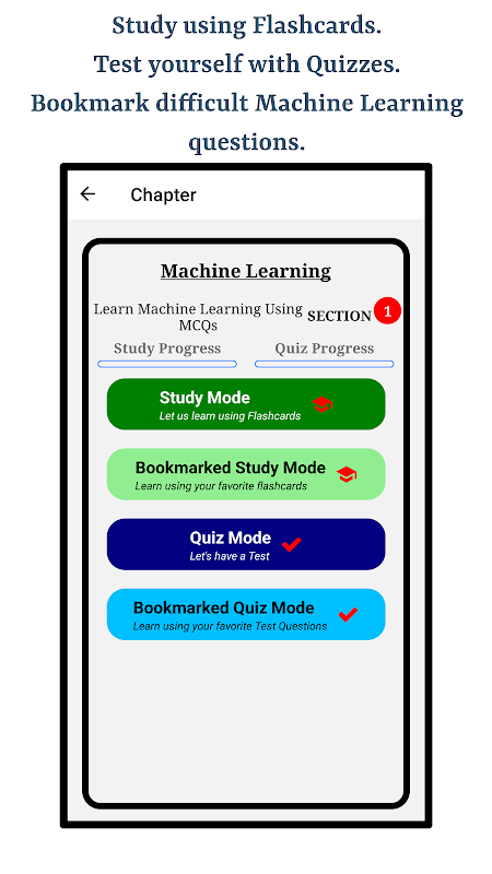 Ta aplikacja to świetne źródło informacji o uczeniu maszynowym. Aplikacja została zaprojektowana tak, aby użytkownicy doskonale rozumieli typowe pytania związane z uczeniem maszynowym, ucząc się przez bardzo krótki czas. Funkcje audio i zakładki są dostępne w całej aplikacji w rozdziałach, sekcjach, trybie nauki i trybach quizu.