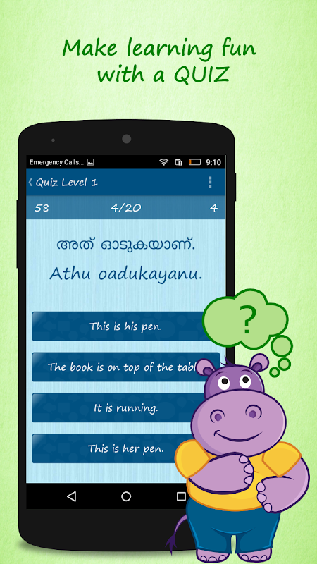 Aplikacja zamienia uczenia się doświadczenie wypełniony zabawą. Dowiedz Malayalam w języku angielskim przy użyciu quizy, karty pamięci flash i nagrywania własnych fraz. Będzie można nauczyć się mówić Malayalam łatwo i szybko w domu, będąc rozrywkę w tym samym czasie. Nie tylko, że musisz nauczyć się mówić malajalam, ale dowiesz się w piśmie / konwersacji Malayalam, jak dobrze!