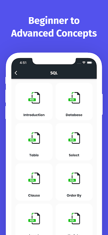 To jest pełna ścieżka do zostania ekspertem MySQL Databases. W tej aplikacji opanujesz i nauczysz się MySQL oraz wielu powiązanych technologii, takich jak SQL, SQLite, PL/SQL, MySQLi i innych. Ta aplikacja pokaże również, w jaki sposób możesz używać MySQL w swoich aplikacjach internetowych, takich jak Java i PHP, oraz tworzyć niesamowite strony internetowe. Ta aplikacja jest całkowicie bezpłatna i możesz uzyskać dostęp do wszystkiego w tej aplikacji bez konieczności korzystania z Internetu. Więc ta aplikacja jest w trybie offline i w ogóle nie wymaga internetu. Również ta aplikacja zaczyna się od podstaw, więc nie musisz w ogóle mieć żadnej wiedzy na temat bazy danych sql. Chociaż podstawowa znajomość PHP i Java na pewno pomoże Ci w nauce MySQL. Możesz sprawdzić nasze aplikacje do nauki języka PHP i języka Java w sklepie.