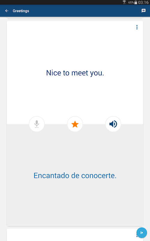 „Dowiedz hiszpański” Aplikacja posiada wiele przydatnych zwrotów i słów, hiszpański (np: „Dziękuję!”, „Ile?” Lub „Stolik dla dwojga, proszę!”). Po dotknięciu frazę, aplikacja mówi tego głośno. Nie ma zgadywania, jak wymówić słowa. A jeśli aplikacja jest mówić zbyt szybko dla ciebie, wystarczy dotknąć ikony ślimak usłyszeć słowa wolniej. A jeśli aplikacja jest mówić zbyt szybko dla ciebie, wystarczy dotknąć ikonę żółwia, aby go usłyszeć wolniej. Wysłuchać wymowy nagrany przez native speaker hiszpański, a następnie nagrywać i odtwarzać swój głos, aby ćwiczyć swoje umiejętności mówienia hiszpańskiego!