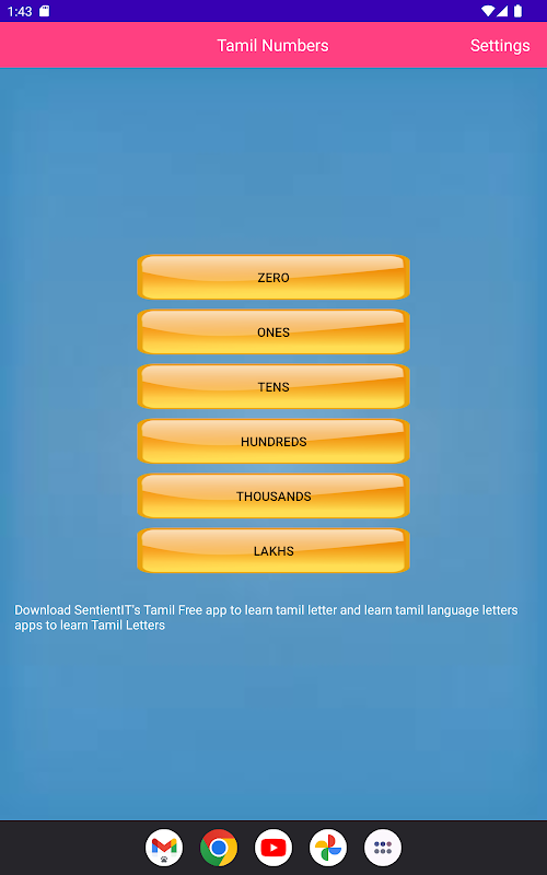 Poćwicz zapisywanie wszelkiego rodzaju liczb tamilskich; Aplikacja umożliwia młodym ćwiczenie pisania i naukę mówienia w języku tamilskim wszelkiego rodzaju. Nie ma ograniczeń co do liczby i kategorii liczb, które dziecko może napisać w języku tamilskim za pomocą aplikacji.