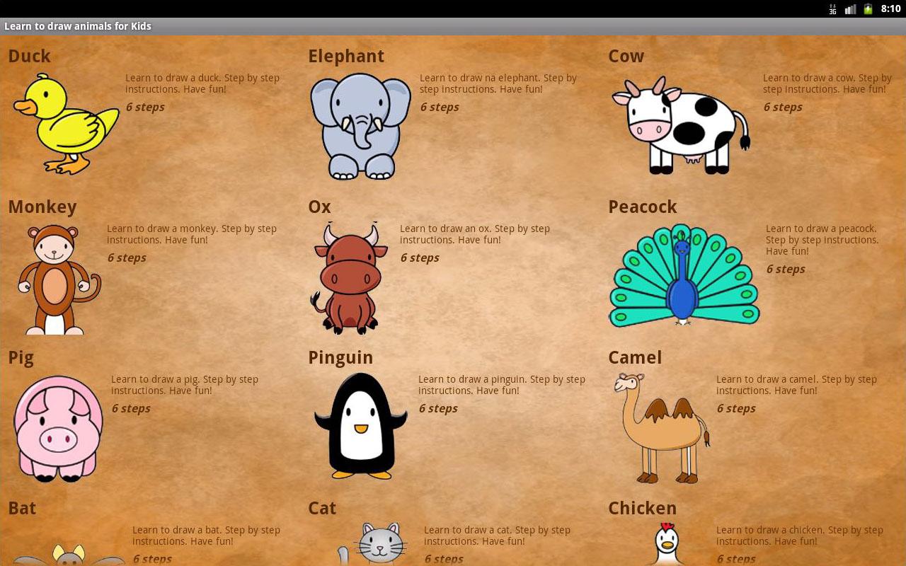 Very simple animal drawings for children age 5 up to 10 years old. They will enjoy the simple interface with step-by-step instructions. Children only have to slide to see the next instruction.
